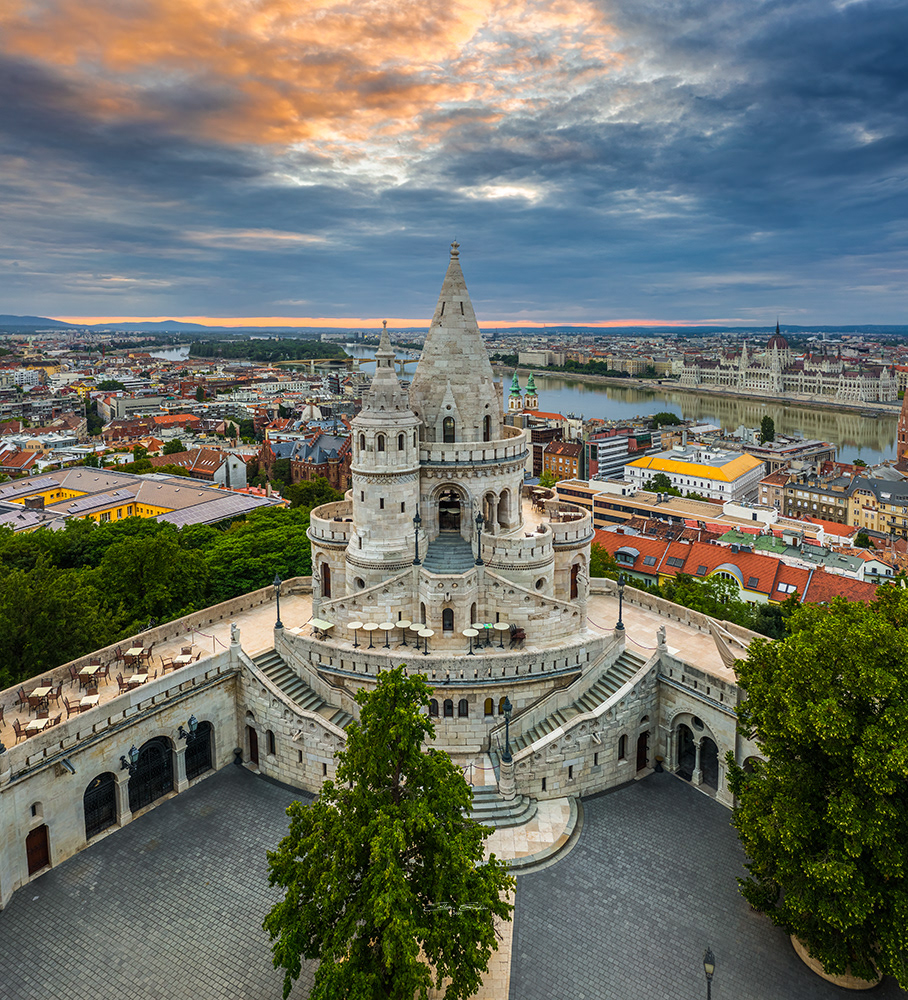 The Fisherman's Bastion (Hungarian: Halászbástya) is one of the best known monuments in Budapest, located in the Buda Castle, in the 1st district of Budapest. It is one of the most important tourist attractions due to the unique panorama of Budapest from the Neo-Romanesque lookout terraces. The Fisherman's Bastion's main facade, parallel to the Danube, is approximately 140 meters long, of which the southern aisle is about 40 meters long, the north is 65 meters long, and the ornate central parapet is 35 meters long. Its seven high-pitched stone towers symbolize the seven chieftains of the Hungarians who founded Hungary in 895. - (via: Wikipedia)